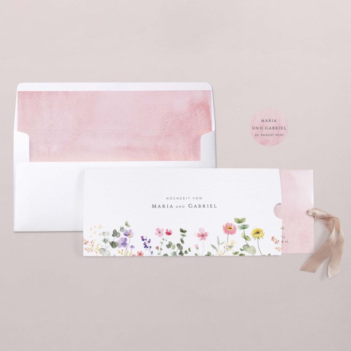 Zarte, farbenfrohe Wildblumen in Aquarell zieren die Hochzeitseinladung "Into the Bloom". Diese poetische Kreation mit ihrem sanften Frühlingscharme ist perfekt, um Ihre Hochzeit in der Sommersaison anzukündigen.