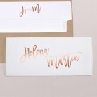 Eine handgeschriebe Typographie vereint mit Ihren Vornamen in Kupfer. Verlieben Sie sich in die Originalität und Eleganz der Hochzeitseinladung Schmuckkästchen.