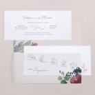 Diese Hochzeitseinladung im Querformat besteht aus einer personalisierbaren Transparentpapier-Banderole mit Motivaufdruck und zwei beidseitig personalisierbaren Einsteckkarten.