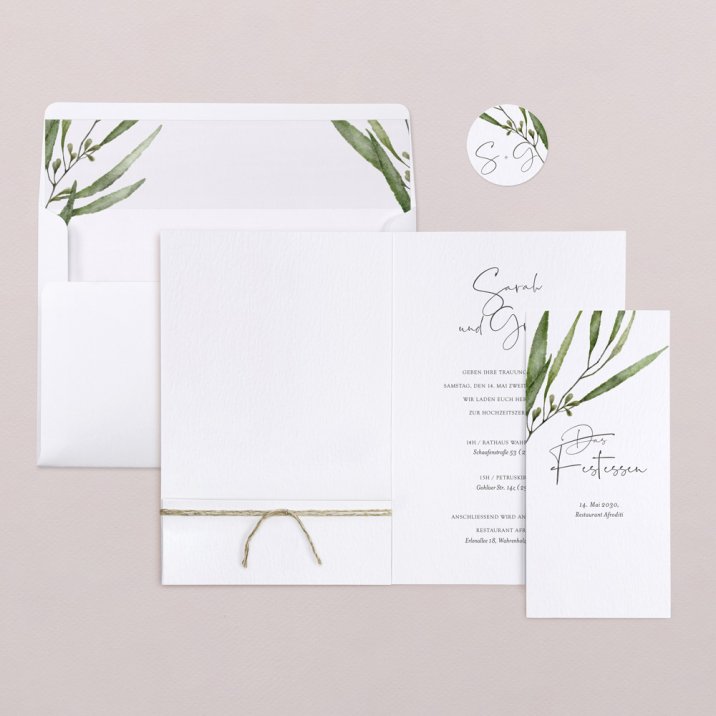 Diese Einladungskarte besteht aus einer Klappkarte mit Einstecklasche, einem Einleger und einem Anhänger. Wir empfehlen den Anhänger an einem schönen Band Ihrer Wahl zu befestigen (Band als Accessoire bestellbar). Die Löcher zur Befestigung des Bandes sind auf der Karte und dem Anhänger vorgestanzt. Einlegekarte und Anhänger werden auf einem Bogen geliefert, um Transportschäden zu vermeiden. Die Einzelteile können in wenigen Handgriffen aus dem vorgestanzten Bogen gelöst und zusammen gestellt werden.