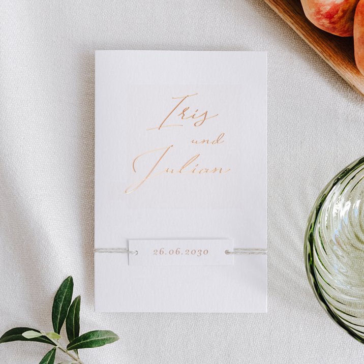 Schlicht, elegant und edel - die Hochzeitseinladung Bernstein harmoniert mit allen Hochzeitsthemen. Ihre Gäste werden von der Zartheit des Designs und dem edlen Kupfer-Finish begeistert sein.