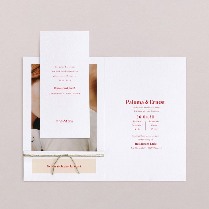 Diese Einladungskarte besteht aus einer Klappkarte mit Einstecklasche, einem Einleger und einem Anhänger. Wir empfehlen den Anhänger an einem schönen Band Ihrer Wahl zu befestigen (Band als Accessoire bestellbar). Die Löcher zur Befestigung des Bandes sind auf der Karte und dem Anhänger vorgestanzt. Einlegekarte und Anhänger werden auf einem Bogen geliefert, um Transportschäden zu vermeiden. Die Einzelteile können in wenigen Handgriffen aus dem vorgestanzten Bogen gelöst und zusammen gestellt werden.