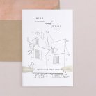 Ein wunderschönes Landhaus ist auf der Hochzeitseinladung Giverny zu sehen. Eine zart skizzierte Kreation als Hommage an einen vertrauten, von Charme und Authentizität erfüllten Veranstaltungsort.