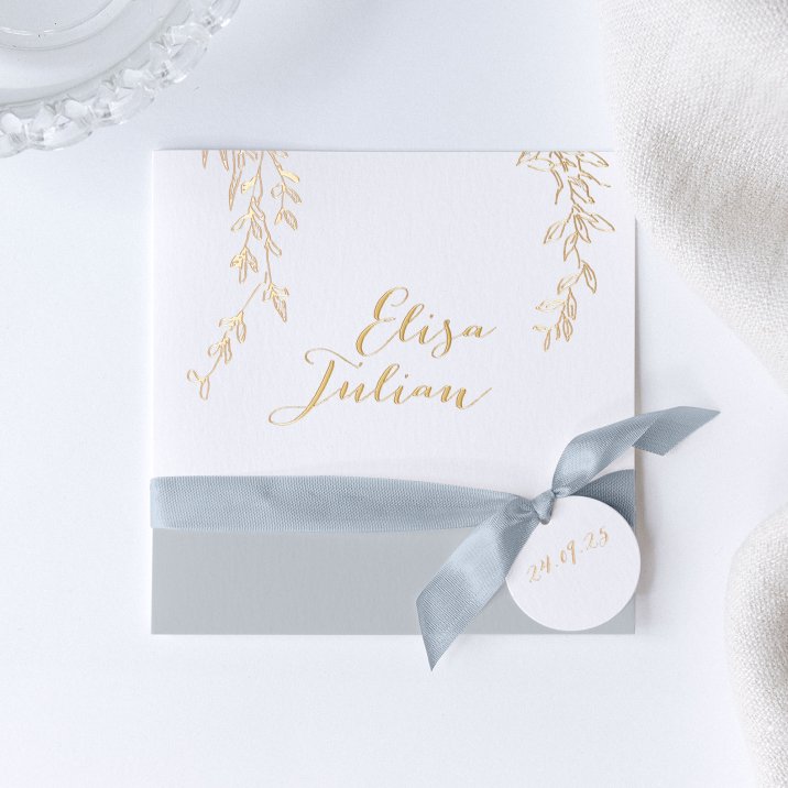 Klassisches Weiß kombiniert mit edlem Graublau und feinsten Goldverzierungen machen diese Einladungskarte zu einem Traum! Für eine Hochzeit, wie sie schöner nicht sein könnte!