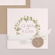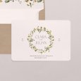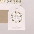 Mit ihrem zarten Blumenkranz aus Margeriten und Kamillenblüten kündigt die Hochzeitseinladung Adriana eine einmalig schöne Sommerhochzeit an, zu der Ihre Gäste sicher gerne erscheinen werden.