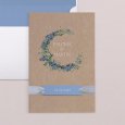 Ein Blumenbogen in verträumten Blautönen, die Vornamen des Brautpaares in raffinierter Typografie und authentischer Kraftpapier-Look: Die Hochzeitseinladung Azzura kündigt eine Hochzeitsfeier (auf dem Land) an, die Sie nicht verpassen sollten!