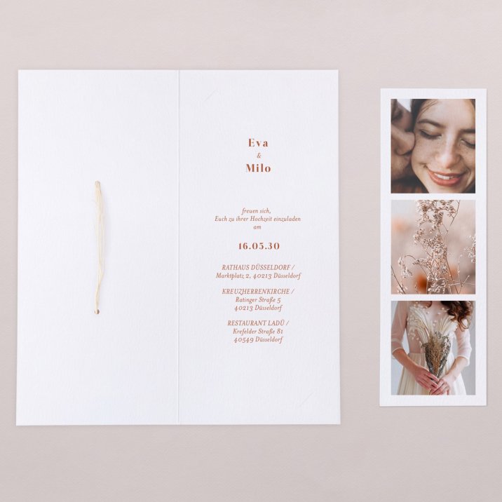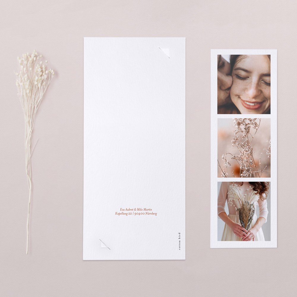 Diese Hochzeitseinladung besteht aus einer Klappkarte im Hochformat und einem herausnehmbaren Fotostreifen mit Platz für 3 Ihrer schönsten Fotos. Der Streifen kann als Erinnerung an den Kühlschrank gepinnt oder als Lesezeichen genutzt werden.
