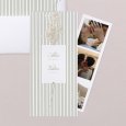 Diese Hochzeitseinladung besteht aus einer Klappkarte im Hochformat und einem herausnehmbaren Fotostreifen mit Platz für 3 Ihrer schönsten Fotos. Der Streifen kann als Erinnerung an den Kühlschrank gepinnt oder als Lesezeichen genutzt werden.