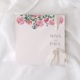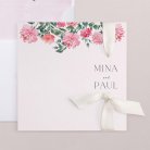 Die Hochzeitseinladung Roses and red zeigt ein prächtiges Blumenbouquet in Rosatönen, das die Vornamen des Brautpaares krönt. Elegant in Aquarell gezeichnet, kündigt dieses Design Ihre romantische Verbindung an.