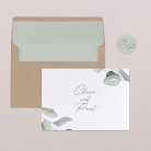Zart illustrierte Eukalyptuszweige auf weißem Papier machen die Hochzeitseinladung Piana zu einem wunderschönen Blickfang. Das Design ist schlicht und elegant zugleich und weckt Vorfreude auf ein unvergessliches Hochzeitsfest.