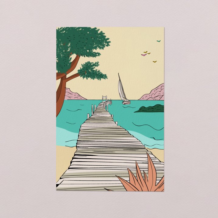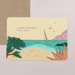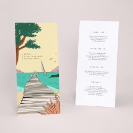 Ein Steg ins Meer, kristallklares Wasser, majestätische Kiefern und rote Felsen: ein versteckter Strand den nur das Brautpaar kennt. Die Hochzeitseinladung Sardinien bringt Braut und Bräutigam zum Träumen und macht Lust auf eine Hochzeit am Meer.