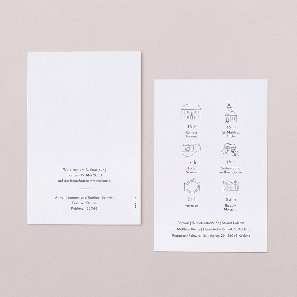 Hochzeitseinladung zum Aufklappen mit Fensterausschnitt und herausnehmbarer Einlegekarte. Die Klappkarte und der Einleger sind beidseitig personalisierbar.