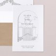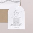 Auf der Hochzeitseinladung Monceau zeichnet sich ein majestätisches Tor ab, welches mit Pflanzenornamenten geschmückt ist. Ein schickes Design mit einem Hauch von Bukolik, das bereit ist, die wichtigsten Details einer Hochzeit zu enthüllen, die Sie nicht verpassen sollten.