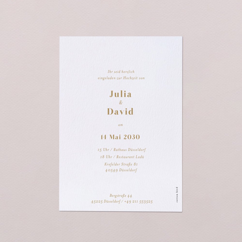 Sagen Sie "Ja" zu Ihrem Schritt ins Glück mit der Einladungskarte Parure. Mit ihrer raffinierten Typografie, der feinen Goldveredelung und den originellen Format verspricht dieses Design Ihren Gästen eine außergewöhnliche Hochzeitsfeier.
