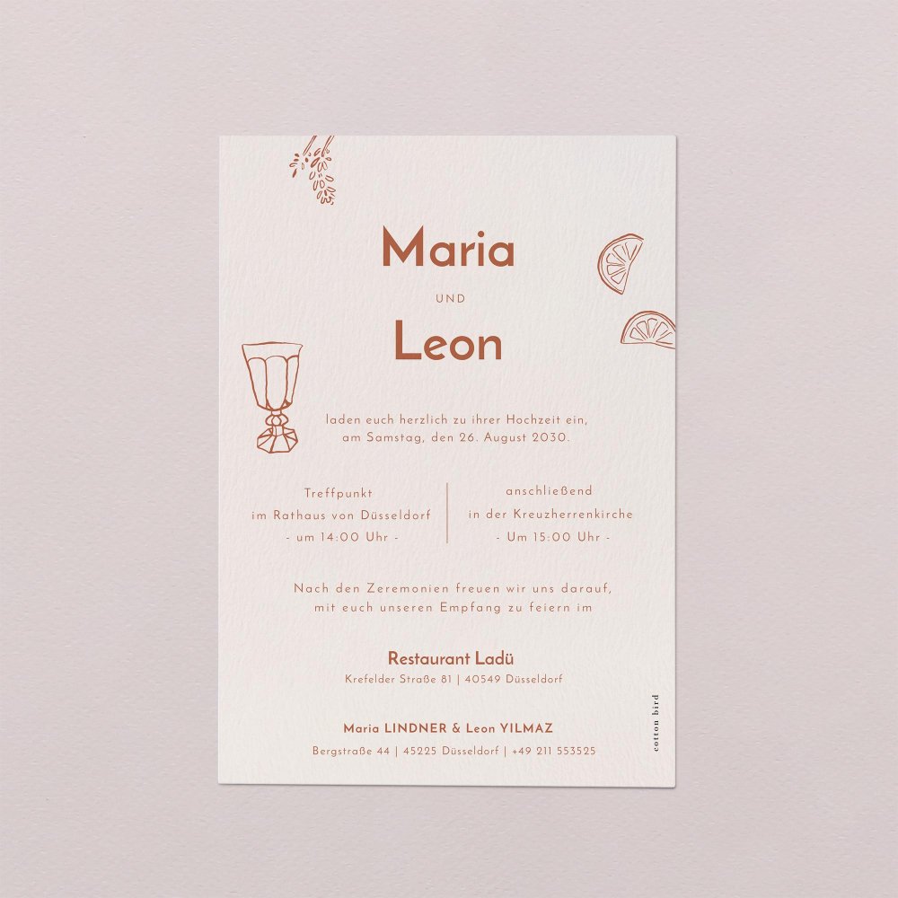 Zitrusfrüchte und Meeresfrüchte werden auf der Hochzeitseinladung Mare Rossa dezent angedeutet und symbolisieren wie ein sanftes Omen die bevorstehende mediterrane Zeremonie.