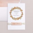 Ein poetischer Kranz aus rosafarbenen Blumen schmückt die Hochzeitseinladung Cottage. Diese zarte, farbenfrohe und frische Kreation ist ideal, um einen besonderen Tag mit einem ländlich-romantischen oder bohème-inspirierten Thema anzukündigen.