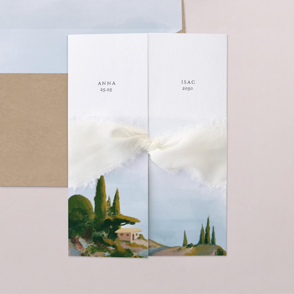 Mit ihrer aquarellierten mediterranen Landschaft wird die Dolce Acqua Hochzeitseinladung Ihre Gäste zu dem einzigartigen Ort bringen, an dem Ihre Liebe gefeiert wird.