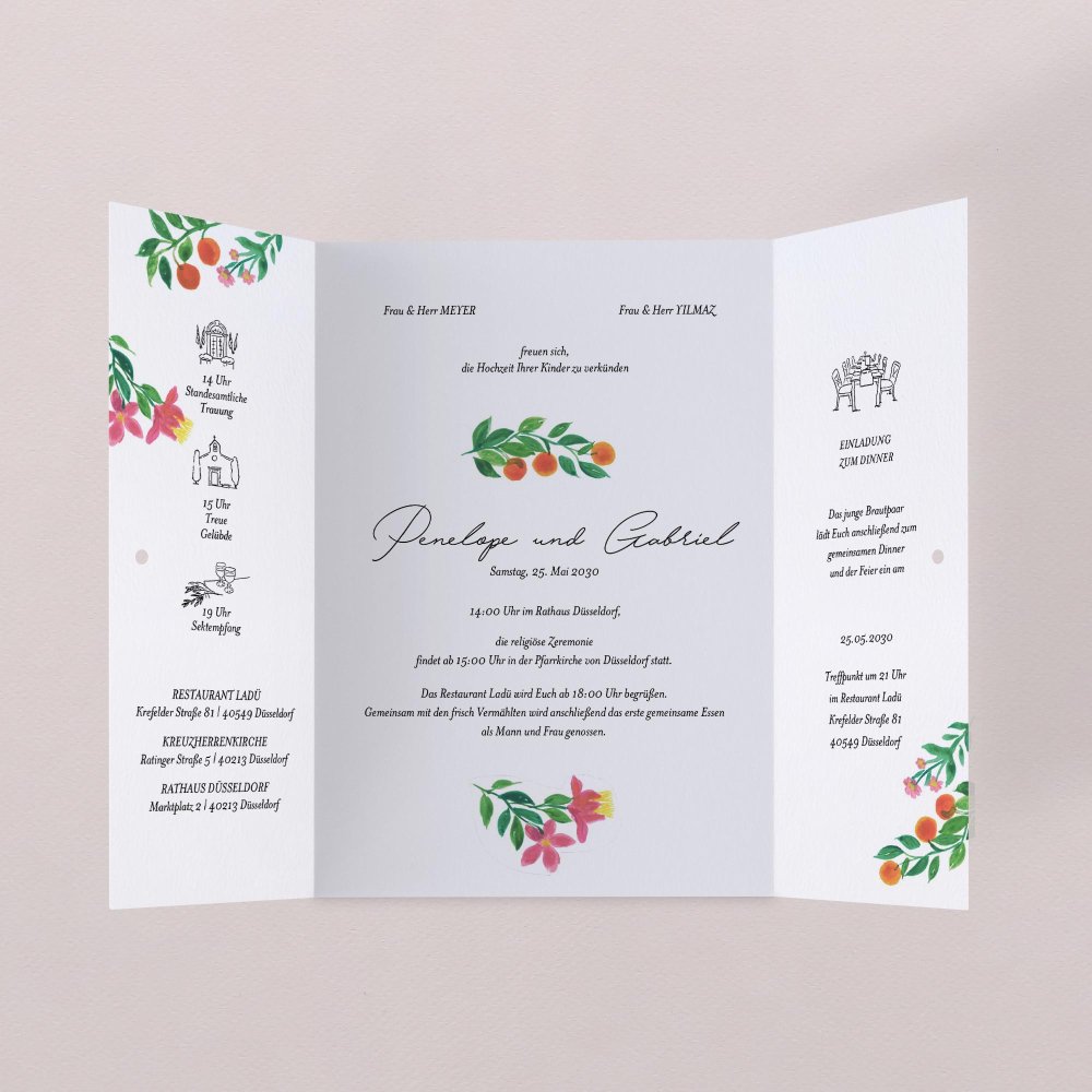 Die Einladungskarte im Hochformat besteht aus einem Mittelteil und zwei einklappbaren Seitenteilen. Im geöffneten Zustand enthüllen sie die wichtigsten Details Ihres schönen Tages. Sie können die Karte mit einem hübschen Band (nach Wahl und gegen Aufpreis) verschließen.