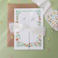 Die Einladungskarte im Hochformat besteht aus einem Mittelteil und zwei einklappbaren Seitenteilen. Im geöffneten Zustand enthüllen sie die wichtigsten Details Ihres schönen Tages. Sie können die Karte mit einem hübschen Band (nach Wahl und gegen Aufpreis) verschließen.