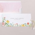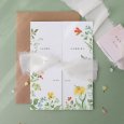 Die Einladungskarte im Hochformat besteht aus einem Mittelteil und zwei einklappbaren Seitenteilen. Im geöffneten Zustand enthüllen sie die wichtigsten Details Ihres schönen Tages. Sie können die Karte mit einem hübschen Band (nach Wahl und gegen Aufpreis) verschließen.