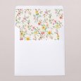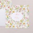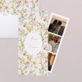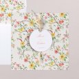 Diese Hochzeitsanzeige besteht aus einer gefalteten quadratischen Karte, die durch ein rundes, gelochtes Etikett verziert wird. Das Etikett lässt sich mit einem separat erhältlichen Band befestigen, das durch zwei Löcher auf der Vorderseite der Karte gezogen wird.