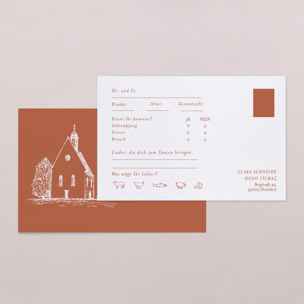 Nach Erhalt der Hochzeitseinladung müssen Ihre Gäste die Antwortkarte nur ausfüllen und können sie ganz einfach als Postkarte an Sie zurücksenden. Die Empfängeradresse ist bereits vorgedruckt und einen Platz für die Briefmarke gibt es auch!