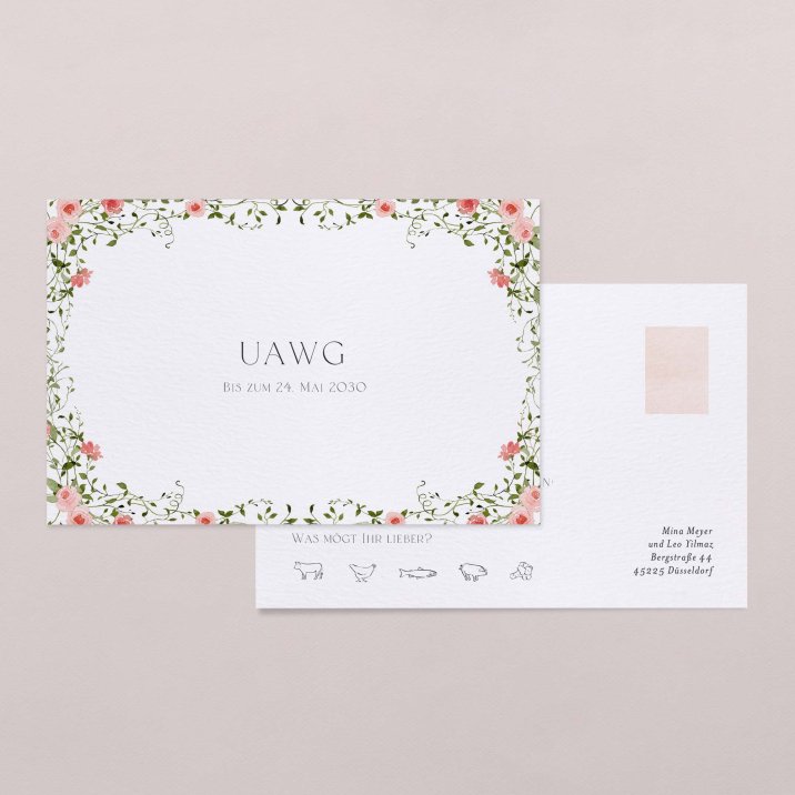 Nach Erhalt der Hochzeitseinladung müssen Ihre Gäste die Antwortkarte nur ausfüllen und können sie ganz einfach als Postkarte an Sie zurücksenden. Die Empfängeradresse ist bereits vorgedruckt und einen Platz für die Briefmarke gibt es auch!