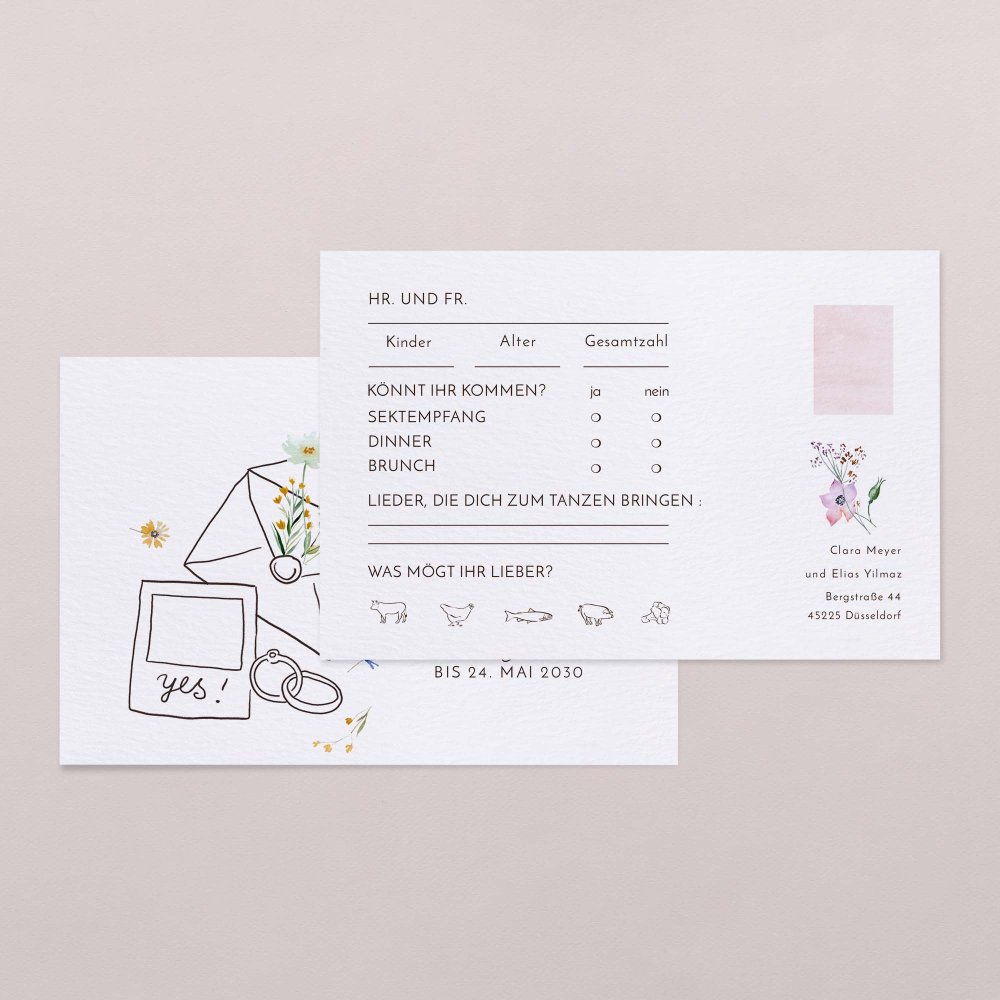 Nach Erhalt der Hochzeitseinladung müssen Ihre Gäste die Antwortkarte nur ausfüllen und können sie ganz einfach als Postkarte an Sie zurücksenden. Die Empfängeradresse ist bereits vorgedruckt und einen Platz für die Briefmarke gibt es auch!