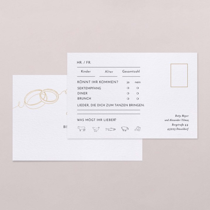 Nach Erhalt der Hochzeitseinladung müssen Ihre Gäste die Antwortkarte nur ausfüllen und können sie ganz einfach als Postkarte an Sie zurücksenden. Die Empfängeradresse ist bereits vorgedruckt und einen Platz für die Briefmarke gibt es auch!