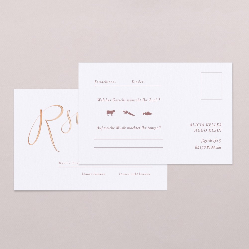 Nach Erhalt der Hochzeitseinladung müssen Ihre Gäste die Antwortkarte nur ausfüllen und können sie ganz einfach als Postkarte an Sie zurücksenden. Die Empfängeradresse ist bereits vorgedruckt und einen Platz für die Briefmarke gibt es auch!