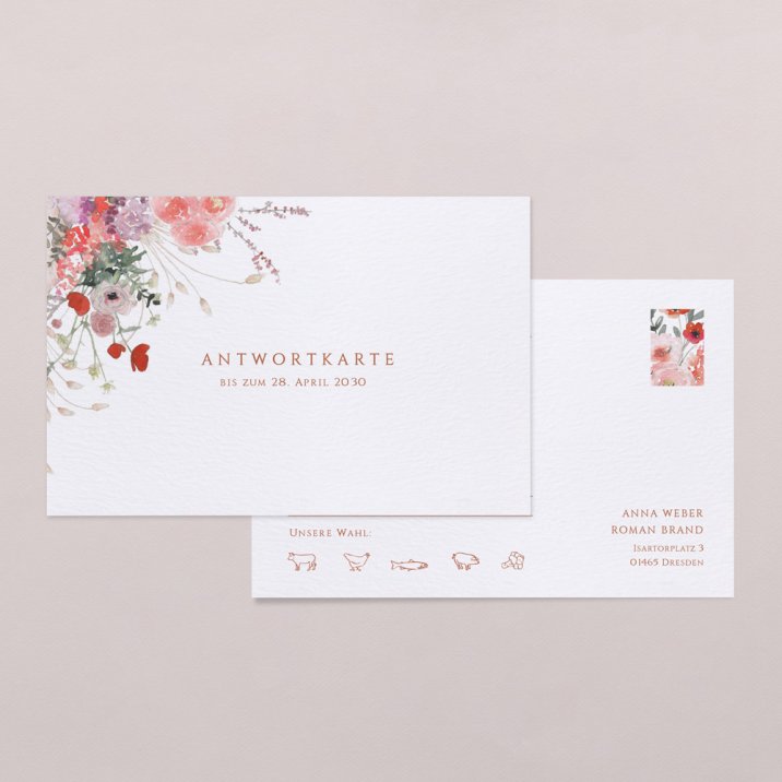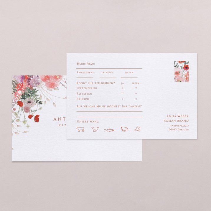Nach Erhalt der Hochzeitseinladung müssen Ihre Gäste die Antwortkarte nur ausfüllen und können sie ganz einfach als Postkarte an Sie zurücksenden. Die Empfängeradresse ist bereits vorgedruckt und einen Platz für die Briefmarke gibt es auch!