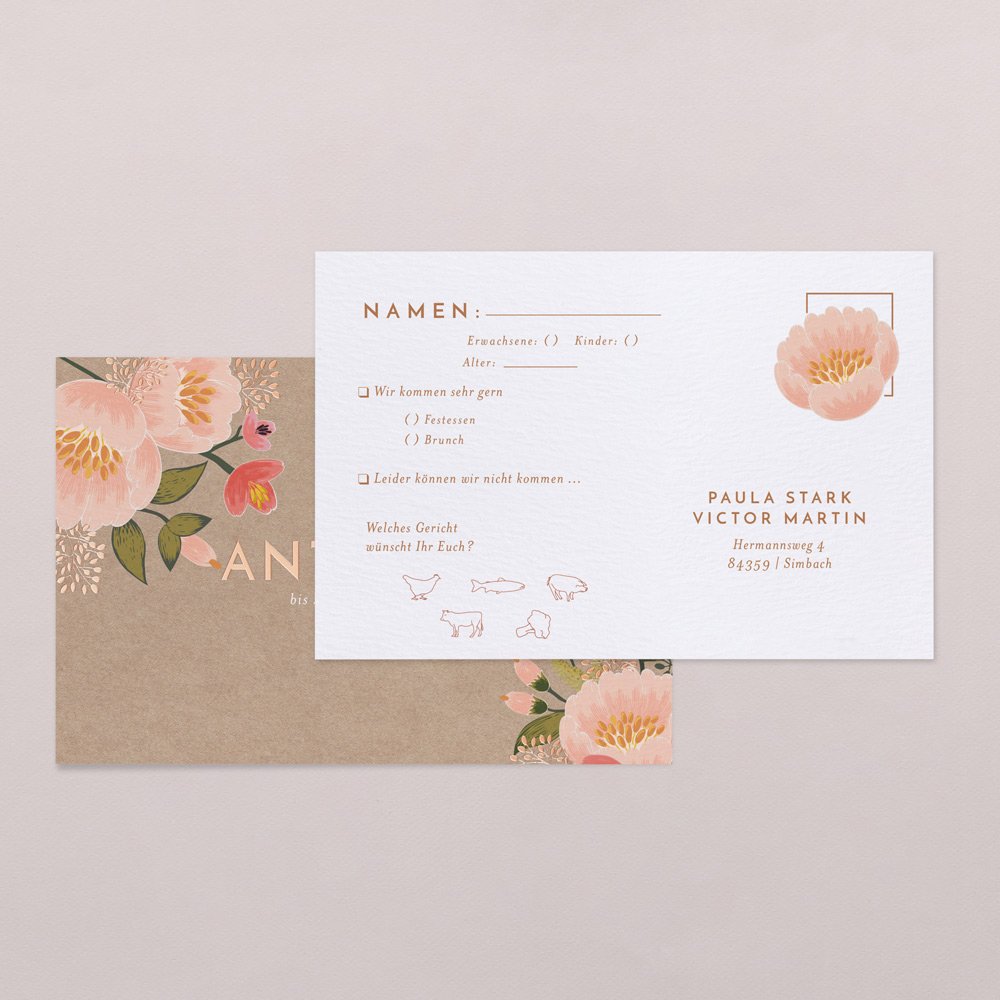 Nach Erhalt der Hochzeitseinladung müssen Ihre Gäste die Antwortkarte nur ausfüllen und können sie ganz einfach als Postkarte an Sie zurücksenden. Die Empfängeradresse ist bereits vorgedruckt und einen Platz für die Briefmarke gibt es auch!