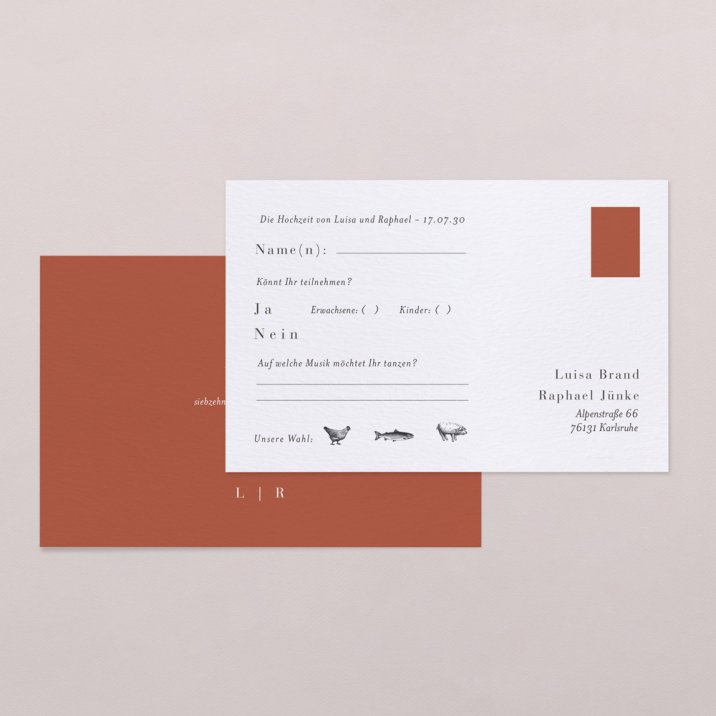Nach Erhalt der Hochzeitseinladung müssen Ihre Gäste die Antwortkarte nur ausfüllen und können sie ganz einfach als Postkarte an Sie zurücksenden. Die Empfängeradresse ist bereits vorgedruckt und einen Platz für die Briefmarke gibt es auch!