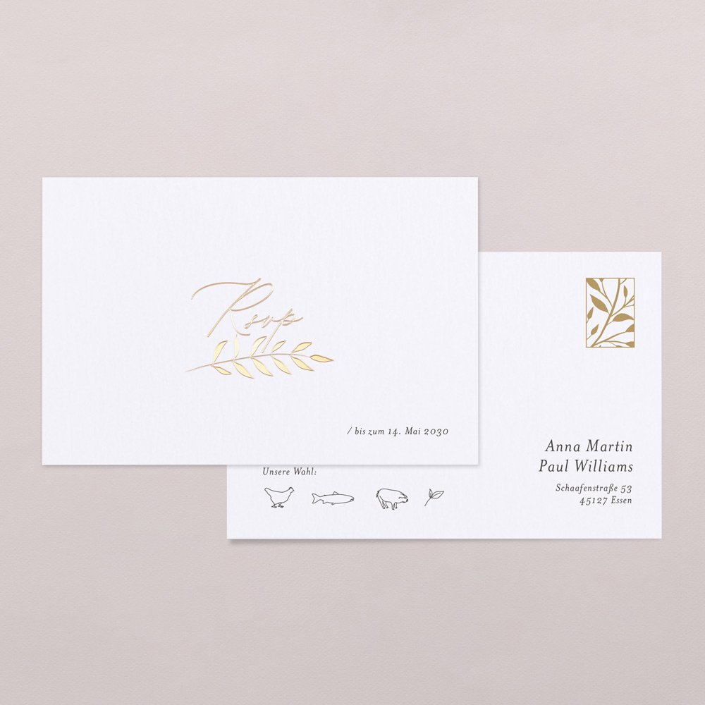 Nach Erhalt der Hochzeitseinladung müssen Ihre Gäste die Antwortkarte nur ausfüllen und können sie ganz einfach als Postkarte an Sie zurücksenden. Die Empfängeradresse ist bereits vorgedruckt und einen Platz für die Briefmarke gibt es auch!