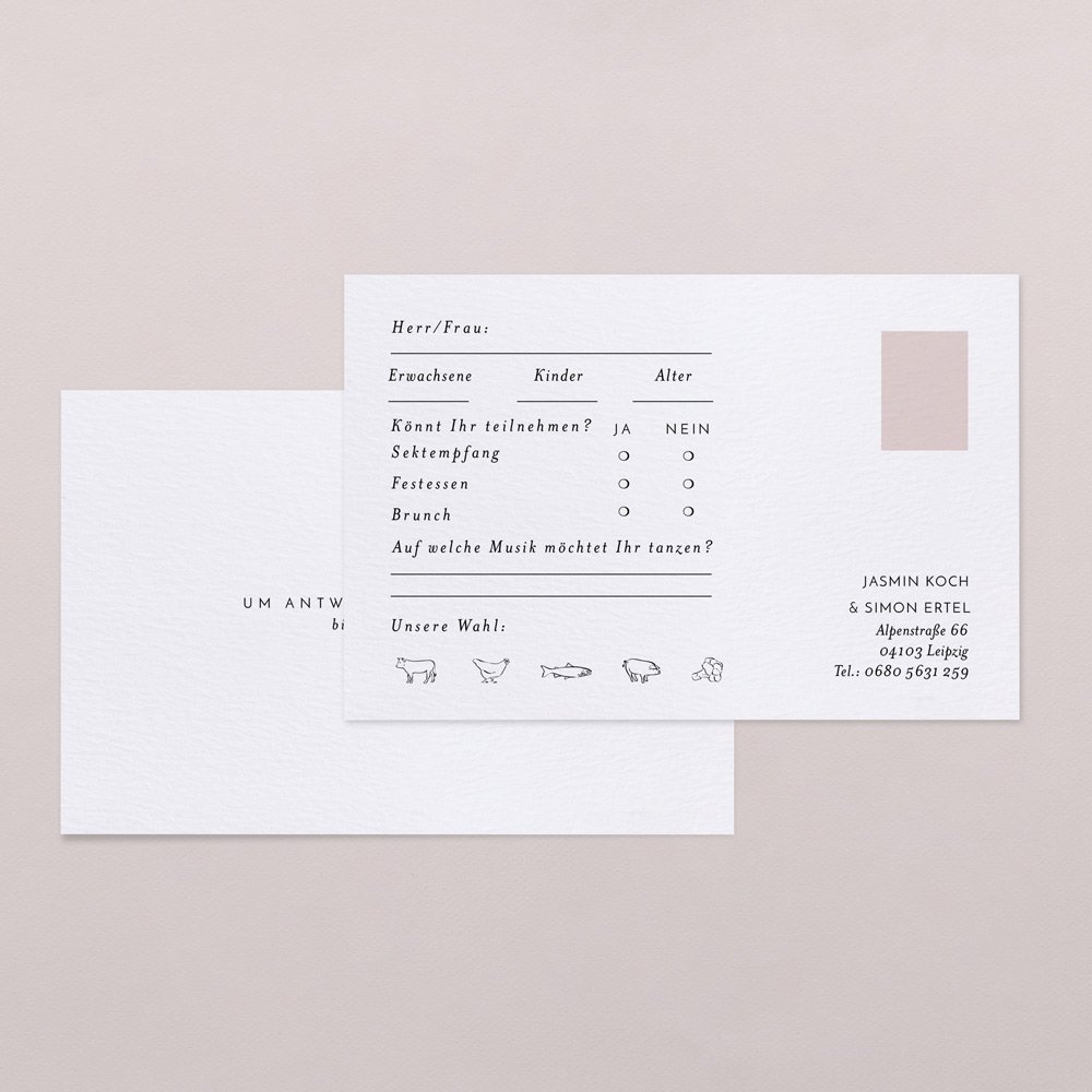 Nach Erhalt der Hochzeitseinladung müssen Ihre Gäste die Antwortkarte nur ausfüllen und können sie ganz einfach als Postkarte an Sie zurücksenden. Die Empfängeradresse ist bereits vorgedruckt und einen Platz für die Briefmarke gibt es auch!