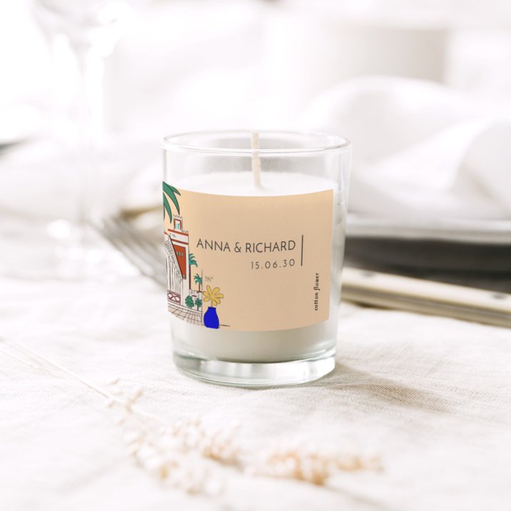 Mit ihrem zarten Duft ist diese kleine personalisierte Kerze ein perfektes Gastgeschenk und eine schönes Andenken an gemeinsam verbrachten Momente.