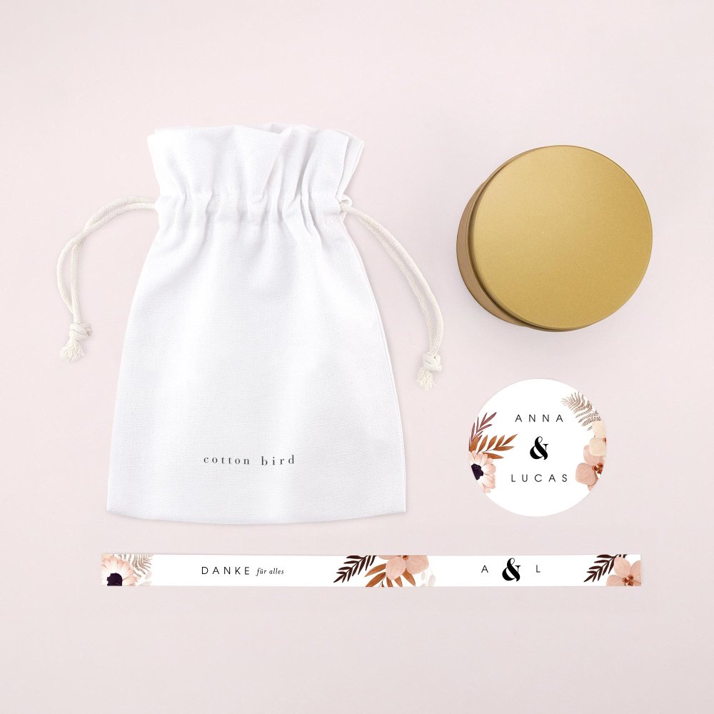 Unsere goldenen Kerzen sind das perfekte Gastgeschenk für Ihre Hochzeit! Der zarte Feigenduft wird Ihre Gäste in sanfte Erinnerung an diesen besonderen Tag zurückversetzen. Die Kerze ist in eine elegante goldene Metalldose gegossen und kann mit Ihren Vornamen, dem Datum Ihrer Hochzeit und einer kurzen Notiz Ihrer Wahl personalisiert werden. Unsere goldenen Kerzen werden in Frankreich hergestellt. Sie werden in einem hübschen Baumwollsäckchen geliefert und enthalten zwei Klebeetiketten pro Kerze, die Sie selbst gestalten und aufkleben können.
