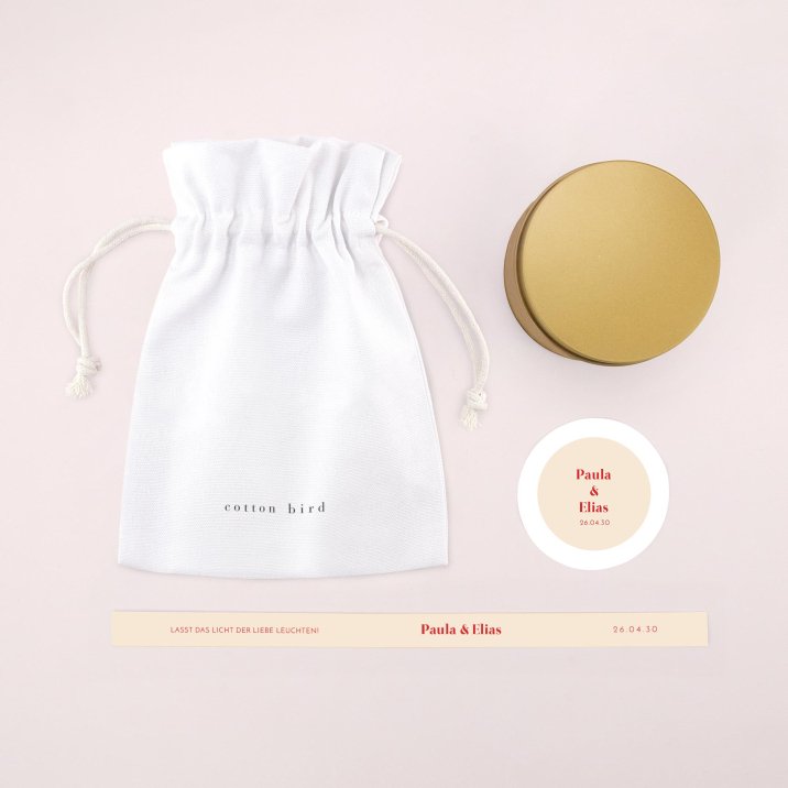 Die Kerze ist in eine elegante goldene Metalldose gegossen und kann mit Ihren Vornamen, dem Datum Ihrer Hochzeit und einer kurzen Notiz Ihrer Wahl personalisiert werden.