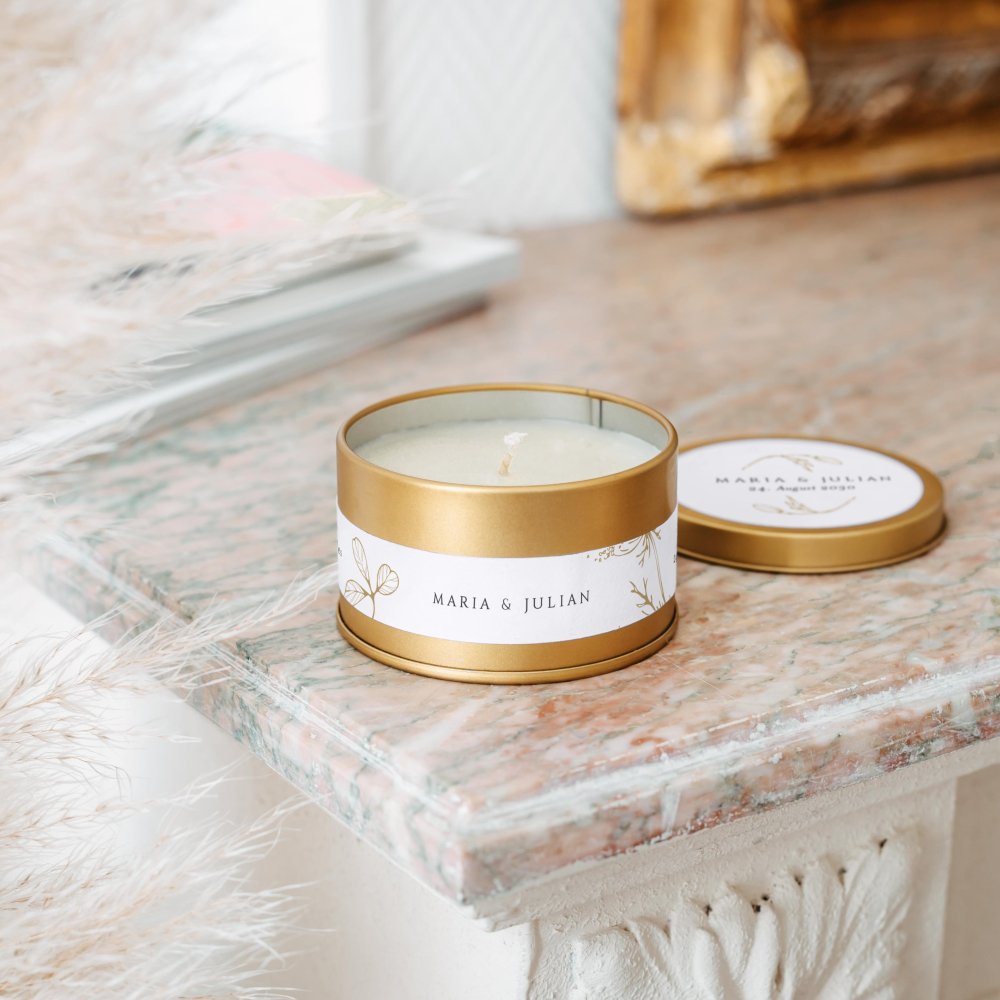 Die Kerze ist in eine elegante goldene Metalldose gegossen und kann mit Ihren Vornamen, dem Datum Ihrer Hochzeit und einer kurzen Notiz Ihrer Wahl personalisiert werden.