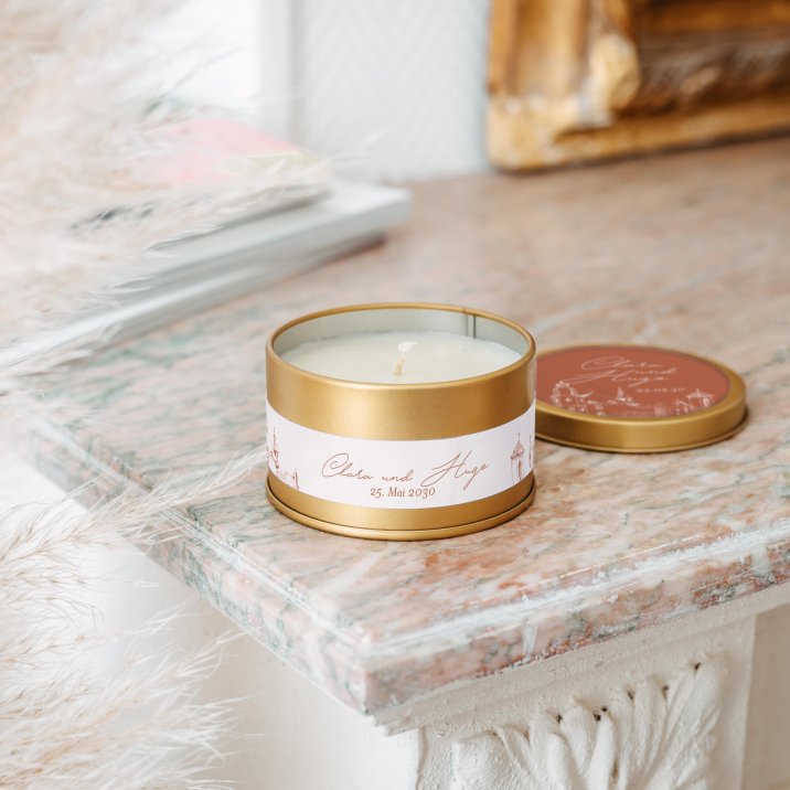 Die Kerze ist in eine elegante goldene Metalldose gegossen und kann mit Ihren Vornamen, dem Datum Ihrer Hochzeit und einer kurzen Notiz Ihrer Wahl personalisiert werden.