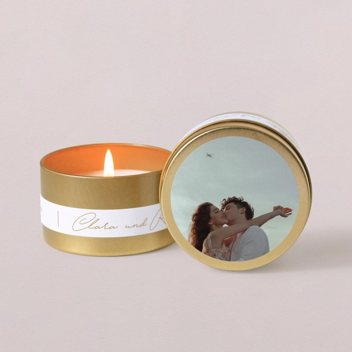 Die Kerze ist in eine elegante goldene Metalldose gegossen und kann mit Ihren Vornamen, dem Datum Ihrer Hochzeit und einer kurzen Notiz Ihrer Wahl personalisiert werden.