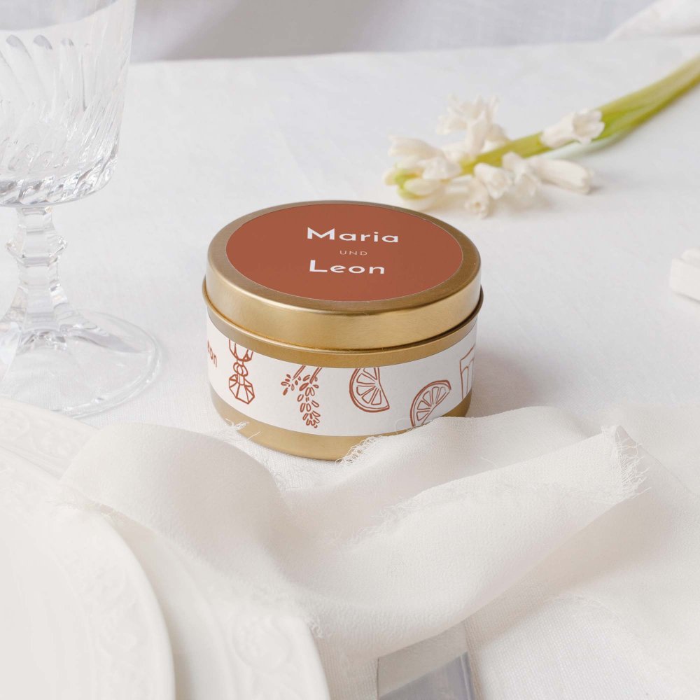 Die Kerze ist in eine elegante goldene Metalldose gegossen und kann mit Ihren Vornamen, dem Datum Ihrer Hochzeit und einer kurzen Notiz Ihrer Wahl personalisiert werden.