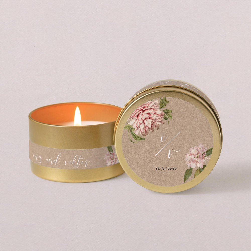 Die Kerze ist in eine elegante goldene Metalldose gegossen und kann mit Ihren Vornamen, dem Datum Ihrer Hochzeit und einer kurzen Notiz Ihrer Wahl personalisiert werden.