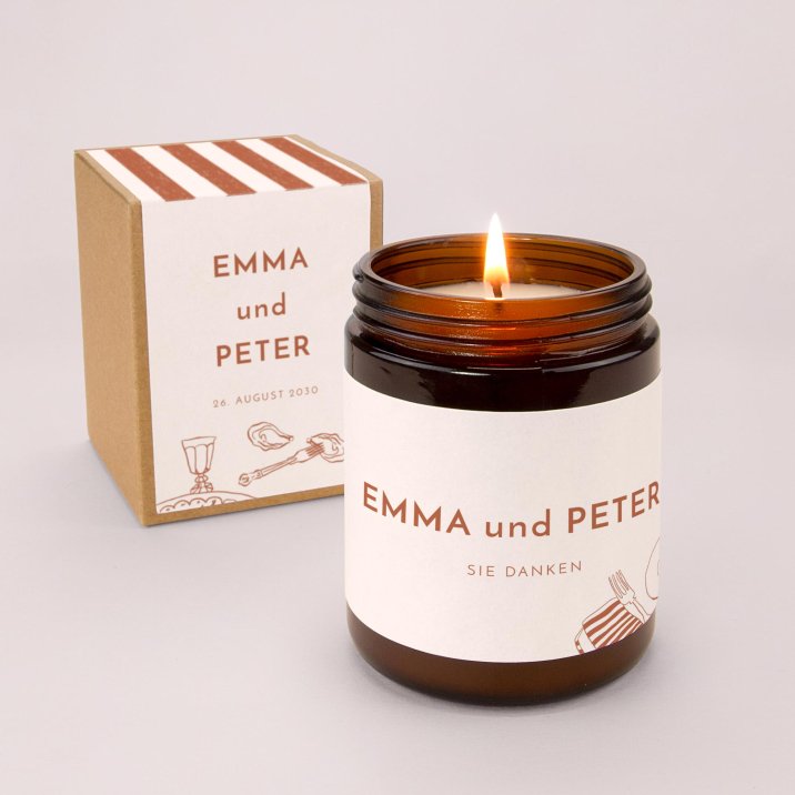 Mit ihrem zarten Duft und ihrem eleganten Vintage-Look ist diese kleine personalisierte Kerze ein perfektes Gastgeschenk und eine schönes Andenken an gemeinsam verbrachten Momente.