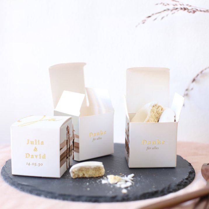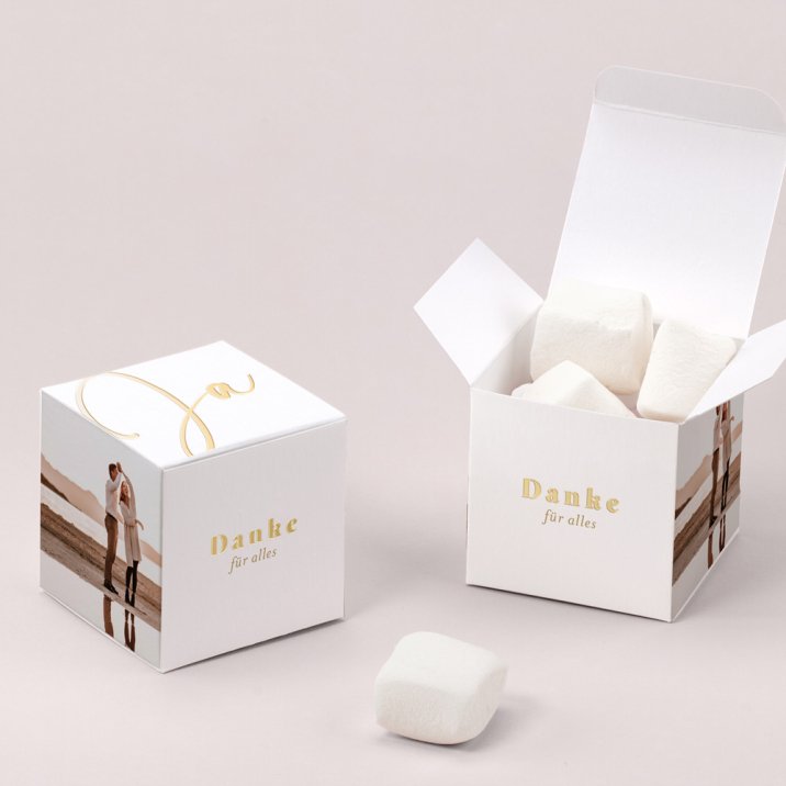 Gestalten Sie die Geschenkbox mit Ihren Namen, dem Hochzeitsdatum und ein paar Dankesworten. Gefüllt werden kann die 5,4 x 5,4 cm große Verpackung mit Süßigkeiten oder einer kleinen Aufmerksamkeit. Lassen Sie Ihrer Fantasie freien Lauf und überraschen Sie Ihre Liebsten mit Bonbons, Macarons, Pralinen oder einem kleinen Geschenk.