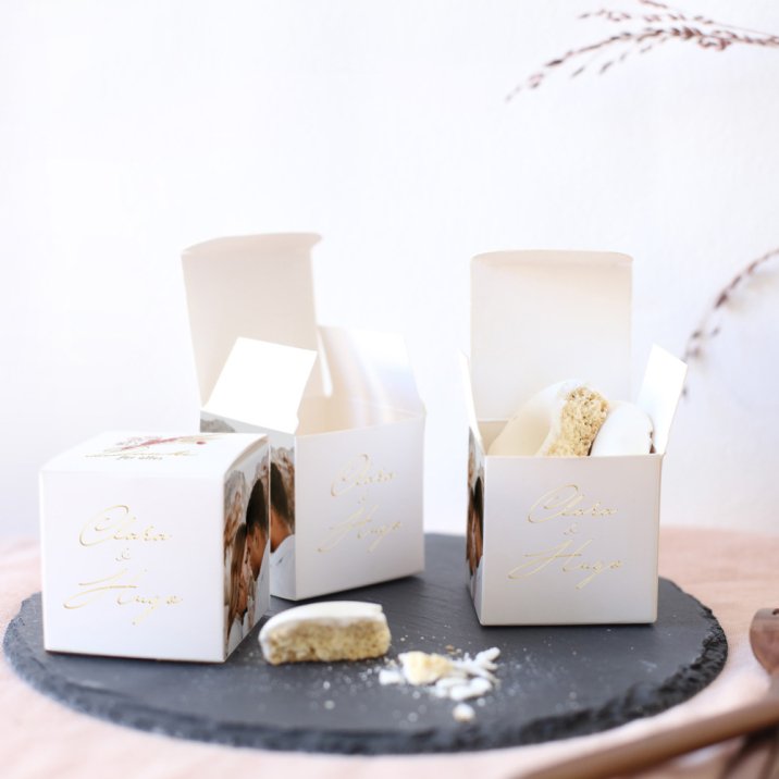 Unsere personalisierbare Geschenkbox ist die perfekte Verpackung für ein kleines Gastgeschenk, das Ihre Hochzeitsgäste nach den Feierlichkeiten sicherlich gerne als Erinnerung mit nach Hause nehmen.