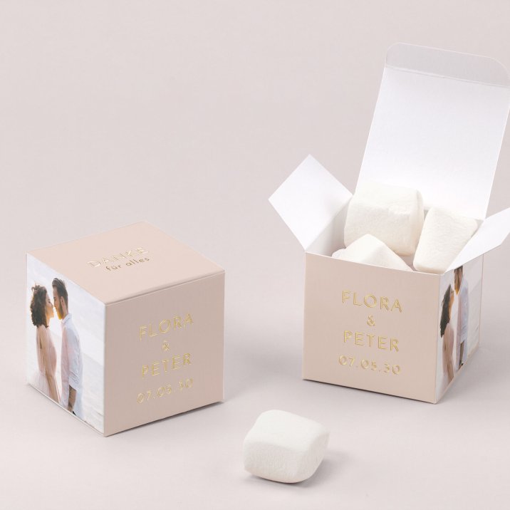 Gestalten Sie die Geschenkbox mit Ihren Namen, dem Hochzeitsdatum und ein paar Dankesworten. Gefüllt werden kann die 5,4 x 5,4 cm große Verpackung mit Süßigkeiten oder einer kleinen Aufmerksamkeit. Lassen Sie Ihrer Fantasie freien Lauf und überraschen Sie Ihre Liebsten mit Bonbons, Macarons, Pralinen oder einem kleinen Geschenk.