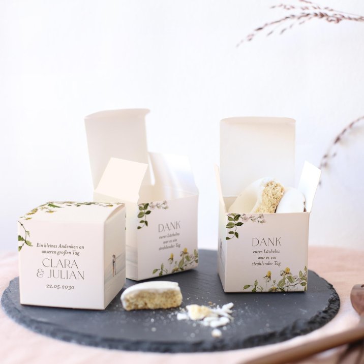 Gestalten Sie die Geschenkbox mit Ihren Namen, dem Hochzeitsdatum und ein paar Dankesworten. Gefüllt werden kann die 5,4 x 5,4 cm große Verpackung mit Süßigkeiten oder einer kleinen Aufmerksamkeit. Lassen Sie Ihrer Fantasie freien Lauf und überraschen Sie Ihre Liebsten mit Bonbons, Macarons, Pralinen oder einem kleinen Geschenk.