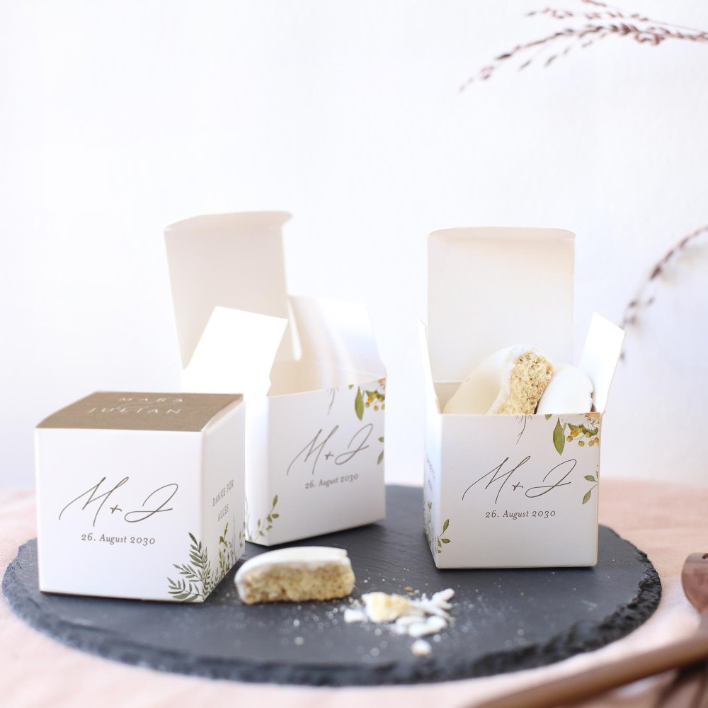 Gestalten Sie die Geschenkbox mit Ihren Namen, dem Hochzeitsdatum und ein paar Dankesworten. Gefüllt werden kann die 5,4 x 5,4 cm große Verpackung mit Süßigkeiten oder einer kleinen Aufmerksamkeit. Lassen Sie Ihrer Fantasie freien Lauf und überraschen Sie Ihre Liebsten mit Bonbons, Macarons, Pralinen oder einem kleinen Geschenk.