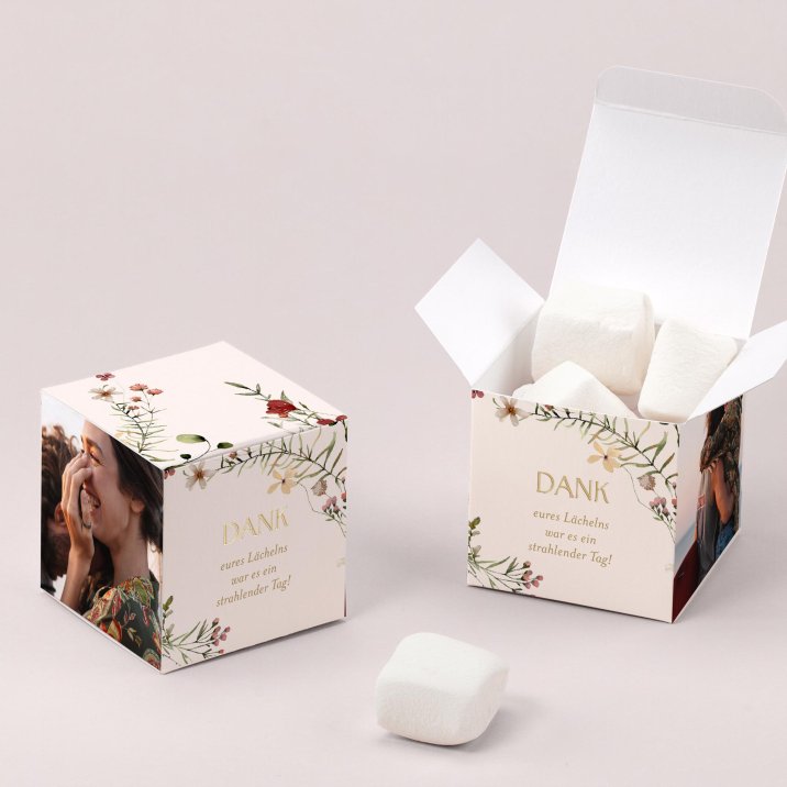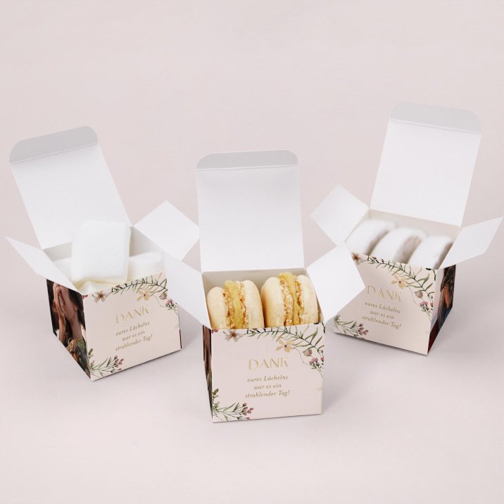 Gestalten Sie die Geschenkbox mit Ihren Namen, dem Hochzeitsdatum und ein paar Dankesworten. Gefüllt werden kann die 5,4 x 5,4 cm große Verpackung mit Süßigkeiten oder einer kleinen Aufmerksamkeit. Lassen Sie Ihrer Fantasie freien Lauf und überraschen Sie Ihre Liebsten mit Bonbons, Macarons, Pralinen oder einem kleinen Geschenk.